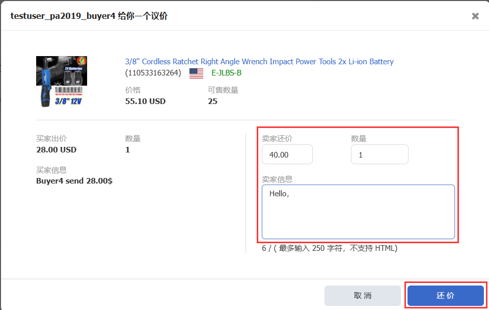 第二步:输入还价的单价和数量,根据需要输入卖家信息 > 点击【还价】。