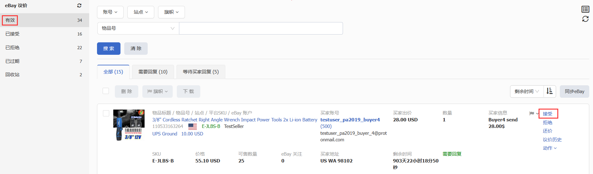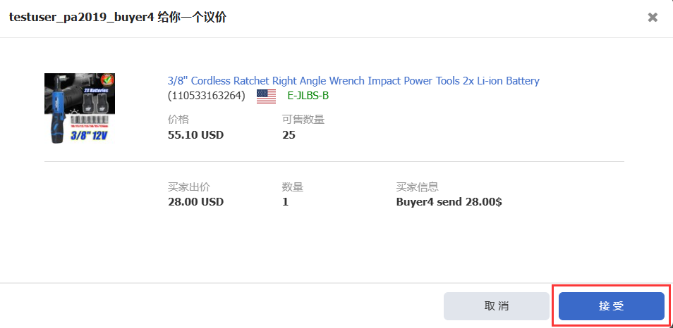 接受议价 1314 Mon, Nov 3, 2025 议价 1230 当您收到买家的议价,请仔细查看买家提供的信息,如议价数量、单价、国家和留言信息等,若您认为议价完全符合您的期望,可接受议价。若完全不符合您的期望,可 拒绝议价 。若您认为还有协商的空间,可提交 还价 。 请按以下步骤接受议价。 第一步:点击【销售】>【有效】>【接受】; 第二步:在弹出窗口中,点击【接受】。 请求提交成功后,该议价将移送至【已接受】状态。同时,eBay 将自动生成一个未付款的订单。