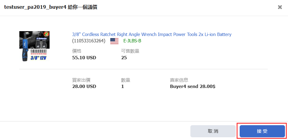 接受議價 1323 Mon, Nov 3, 2025 議價 847 當您收到買家的議價,請仔細查看買家提供的信息,如議價數量、單價、國家和留言信息等,若您認為議價完全符合您的期望,可接受議價。若完全不符合您的期望,可 拒絕議價 。若您認為還有協商的空間,可提交 還價 。 請按以下步驟操作接受議價。 第一步:點擊【銷售】>【有效】>【接受】; 第二步:在彈出窗口中,點擊【接受】。 請求提交成功後,該議價將移送至【已接受】狀態。同時,eBay 將自動生成一個未付款的訂單。