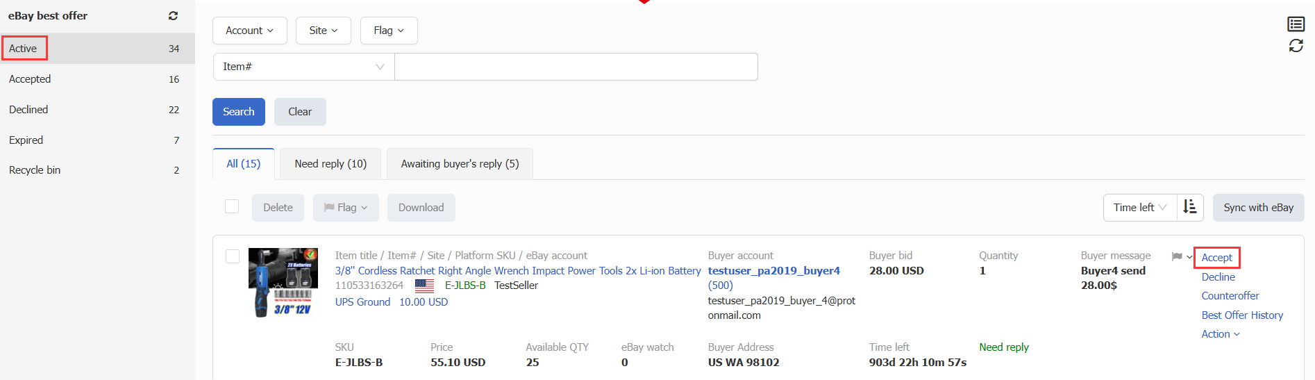 Once the request is submitted successfully, the offer would be moved to [Accepted] status. Meanwhile, an unpaid sales order would be generated by eBay.