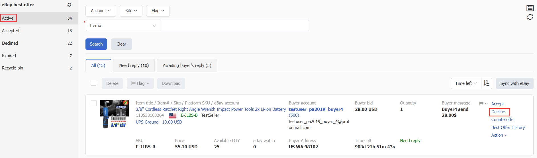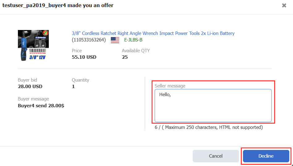 Once you've received a best offer from a buyer, please make a proper decision with consideration of the predefined listing info and provided offer details from buyers, such as the concerned QTY, unit price, destination country and note (if any) etc. If the offer is far away from your expectation, you can decline it.If it lives up to your expectation totally, you can accept offers. If it still has space to negotiate, you can make a counteroffer.