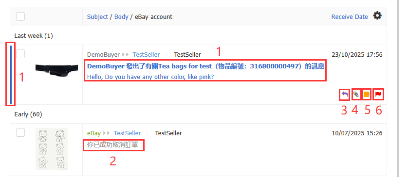 - Red flag icon: Indicates that the message is flagged on eBay (synchronized from eBay).
