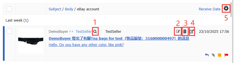 - Gear Icon: Customize displayed columns such as subject, content, item number, or eBay account.