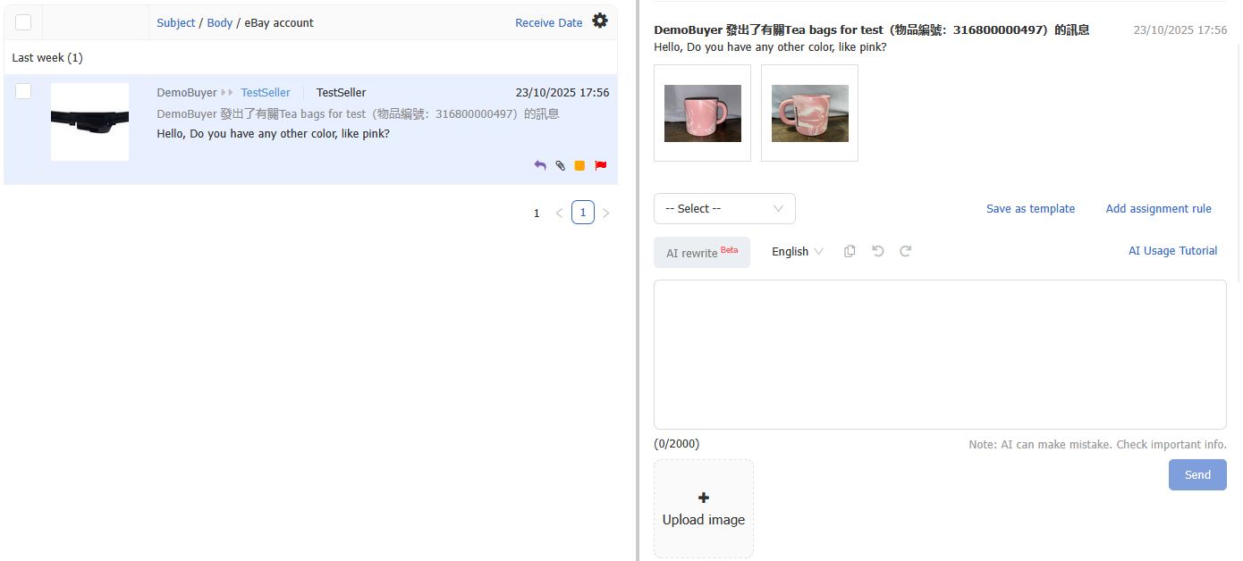 The eBay Message page serves as the central hub for managing all buyer messages and eBay notifications. Users can handle messages from multiple stores within a single interface, without logging in to the eBay backend. The system automatically links buyer transaction records and past conversations, and works together with features such as message template, message rule, and auto message — enabling efficient message management and precise responses.