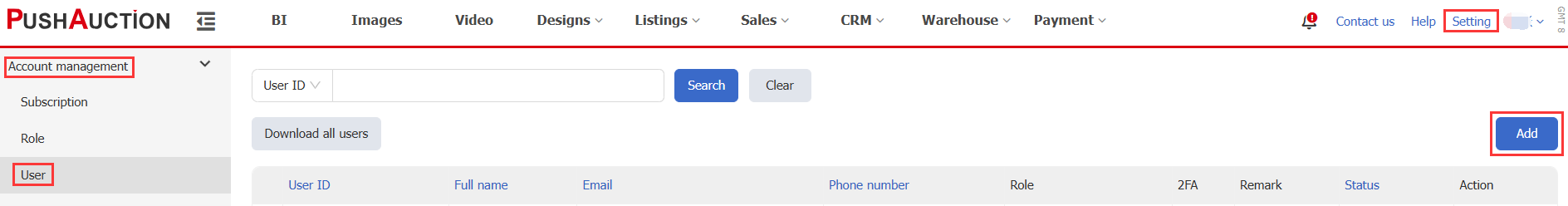 Step 1: Click [Setting] > [Account management] > [Users] > [Add];