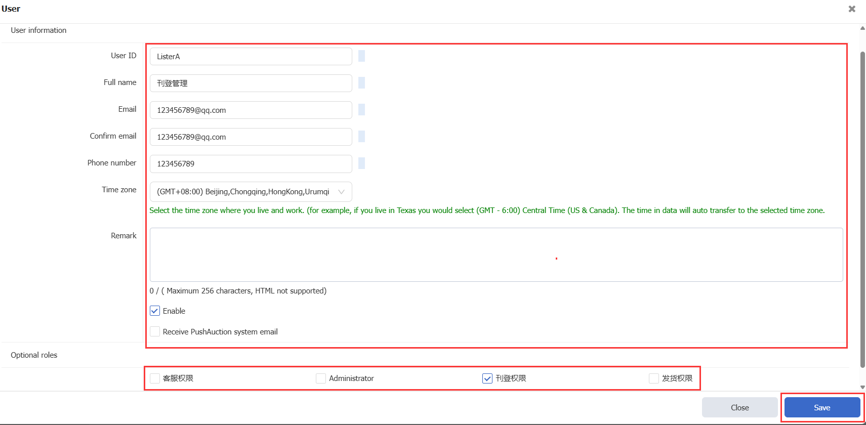 Step 2: Input user info > Check [Enable] > Check at less one role in [Optional roles] > [Save].