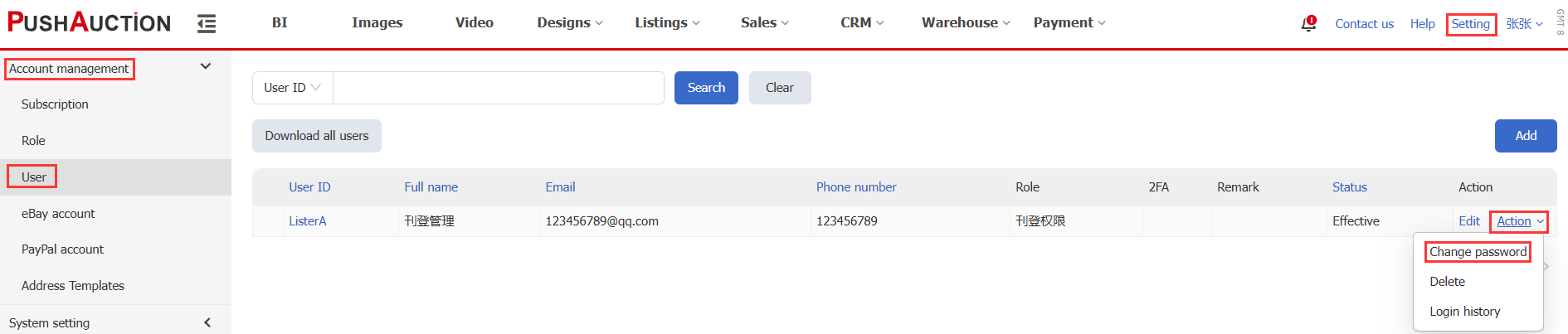 Step 1: Click [Setting] > [Account management] > [User] > [Action] > [Change password];