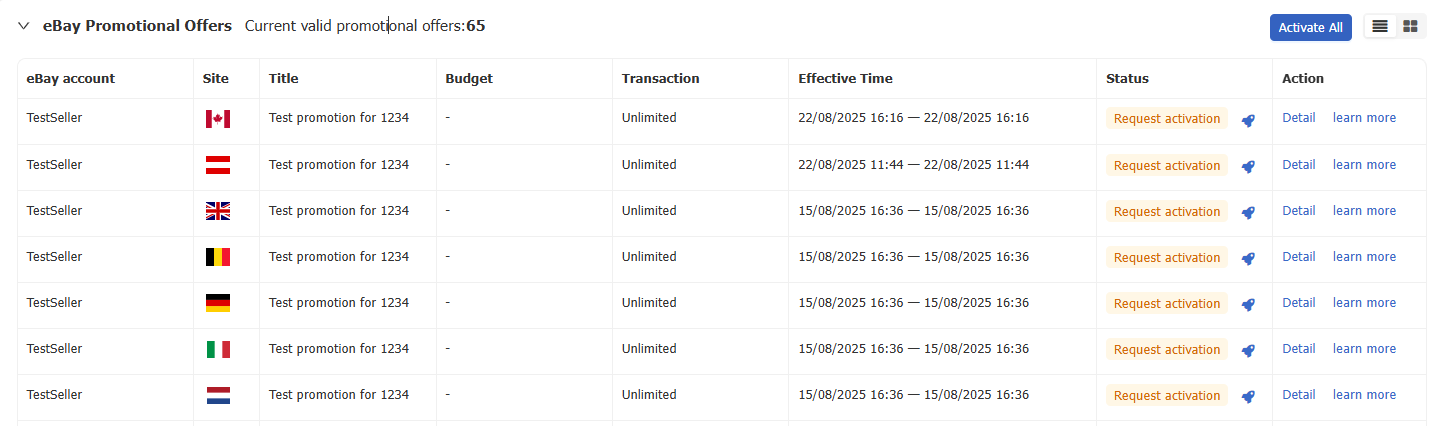 View available or ongoing promotions and activate them directly in the system, reducing switching between eBay and the platform . For detailed operations, please refer to eBay Promotional Offers - Feedback Overview