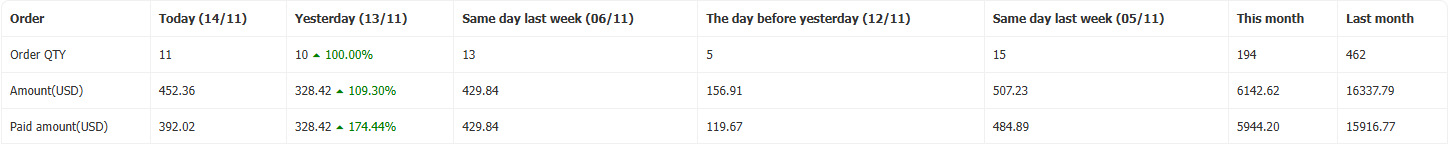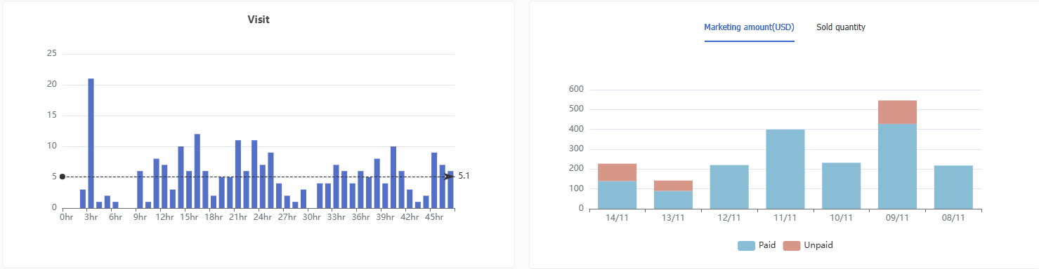b. Sales Trend Charts – Shows sales amount and sold quantity for the past 7 days (including refunded orders) for easy tracking of overall sales trends.