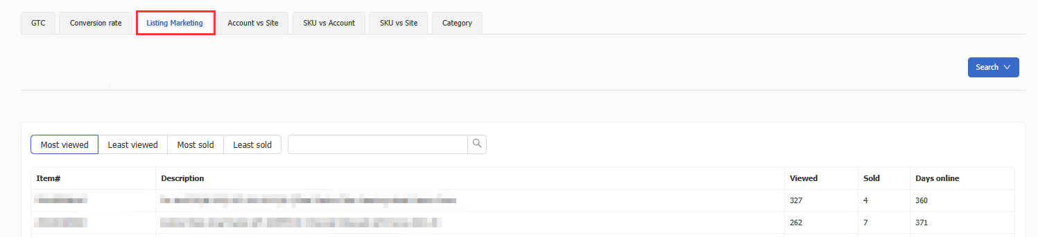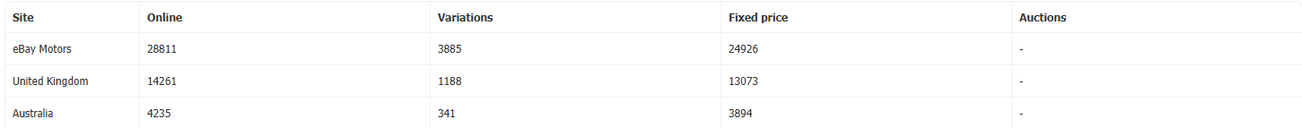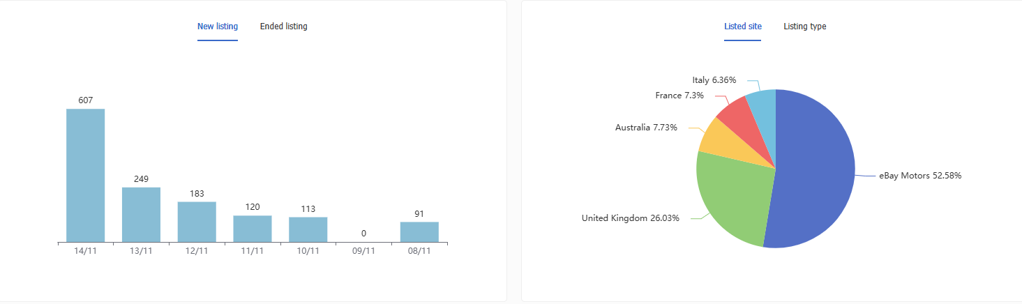 c. Table – View the number of new/ended listings and the distribution of online listings by site/eBay account.