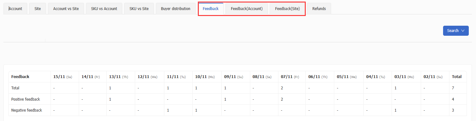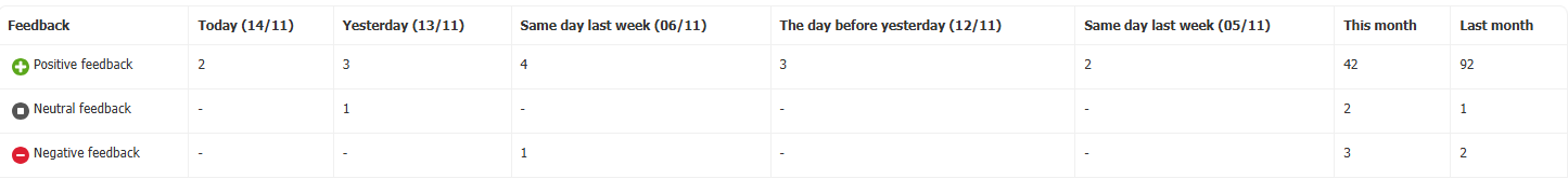 Displays the number of feedback received for today, yesterday, the day before yesterday, this month, and last month—helping sellers track buyer sentiment and evaluate service and product performance.
