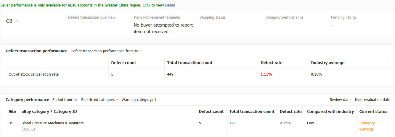 Note:According to eBay policy, only Greater China region accounts support seller performance.