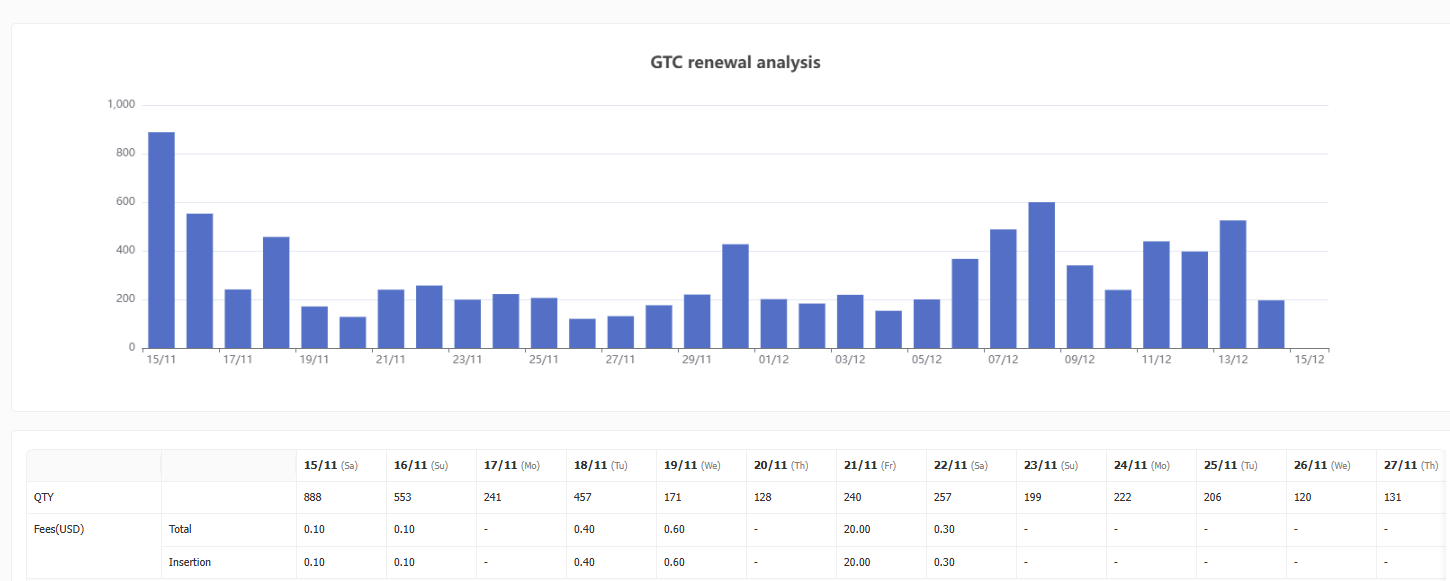 Using intelligent algorithms, the system estimates the number of GTC (Good ’Til Cancelled) listings that will be renewed each day in the next 30 days along with projected fees. This helps sellers anticipate listing costs and manage expenses more effectively.