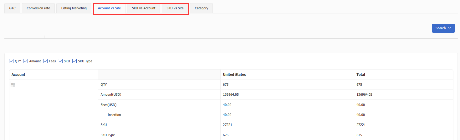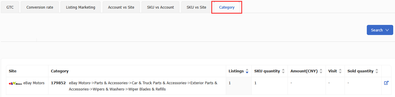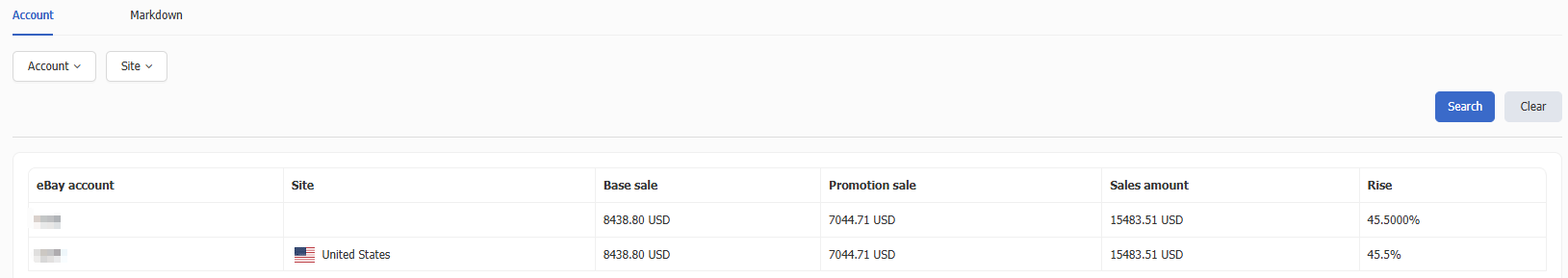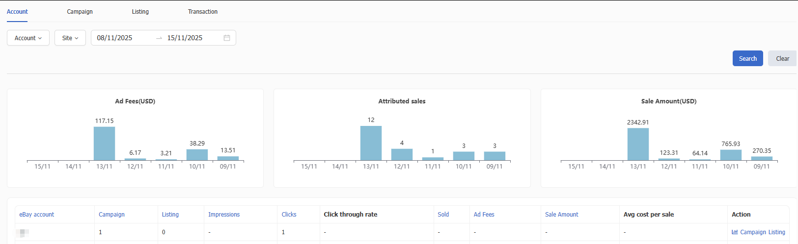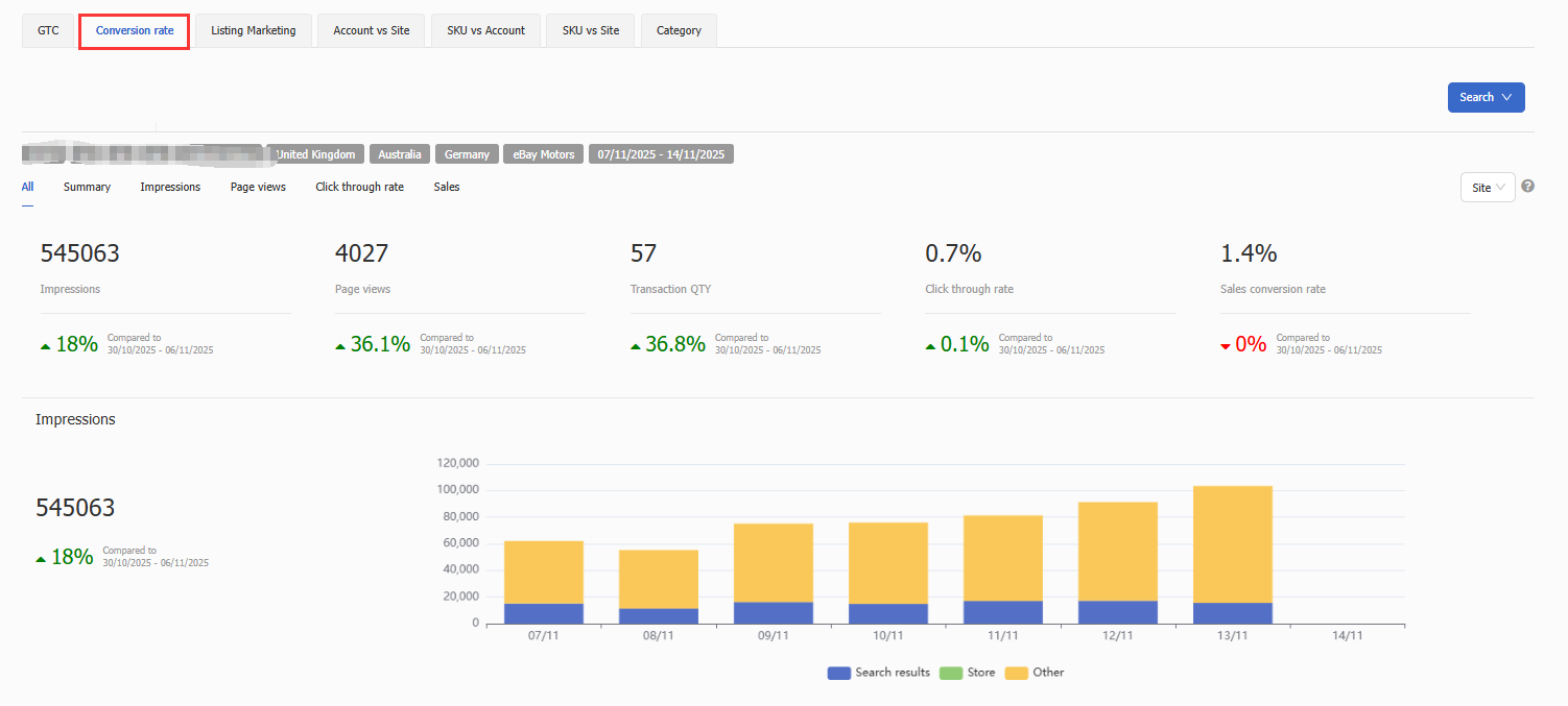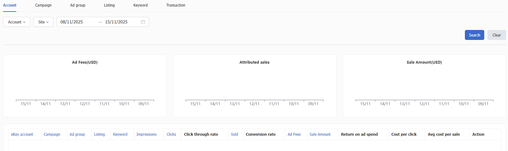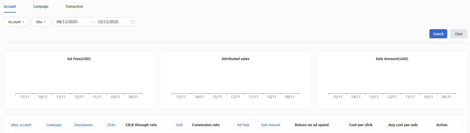 Using the top-right search feature, you can filter by date range to view impressions, views, CTR, and sales for each eBay account across different sites—helping you evaluate account-level traffic and conversion performance. For more details, please refer to Account/Listing Conversion Rate - Listing Marketing Analysis