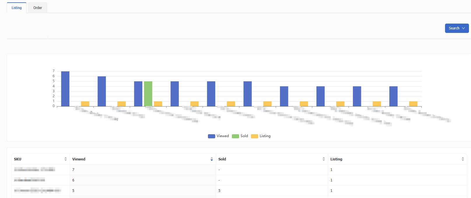 - Listing Dimension - Displays the top 100 SKUs with the highest/lowest traffic or sold quantity, helping sellers identify best-selling products and underperforming listings.