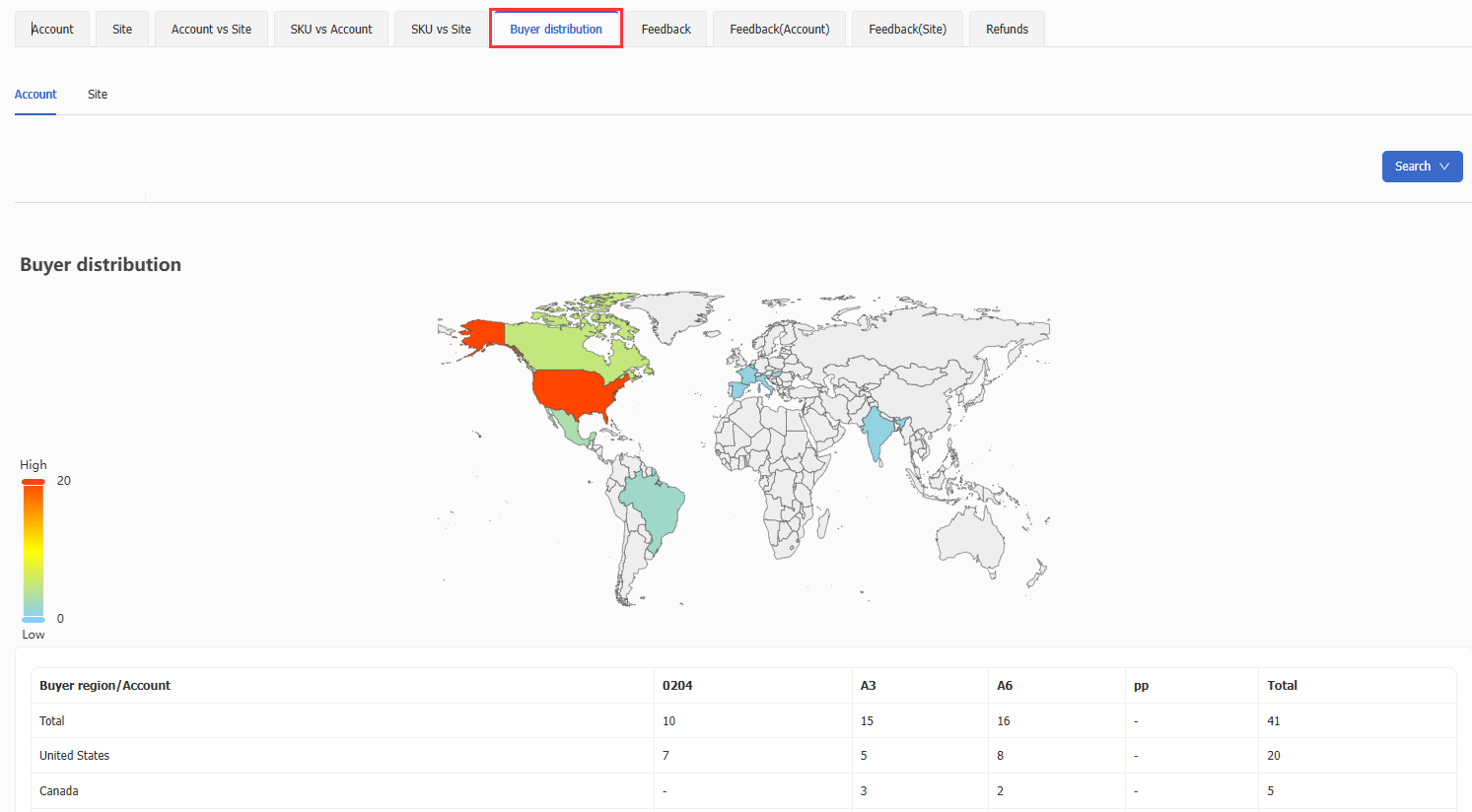 View the shipping destination distribution of buyers for each account/site. - Feedback Analysis