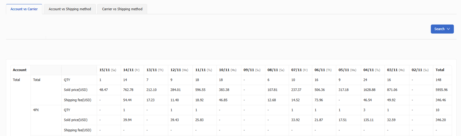 - Account vs Carrier - Displays order quantity, sales amount, and shipping cost for each carrier under each eBay account.
