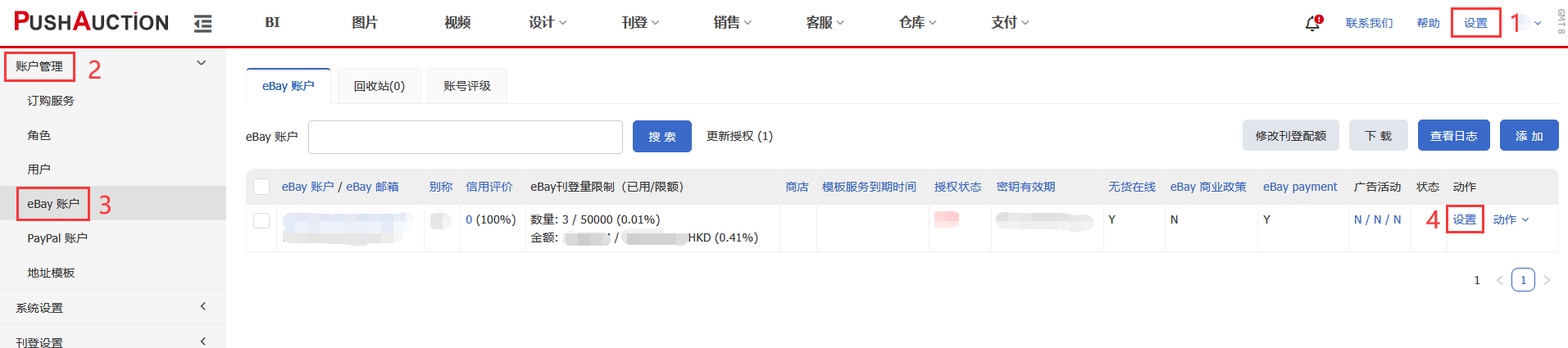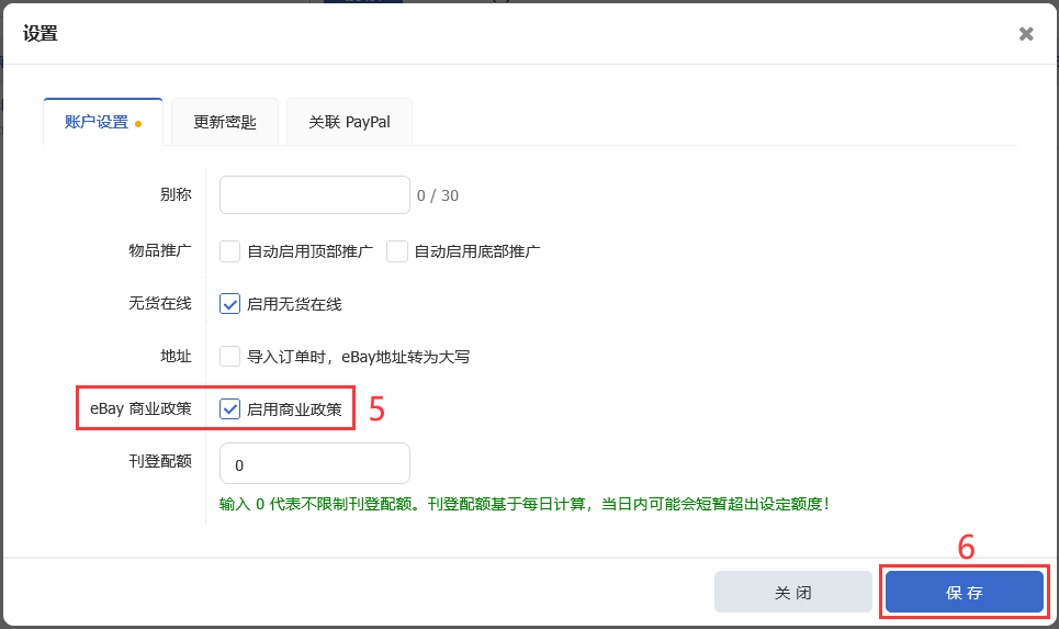 点击右上角【设置】>【账户管理】>【eBay账户】> 右侧【设置】> 勾选【启用商业政策】 > 点击【保存】。
