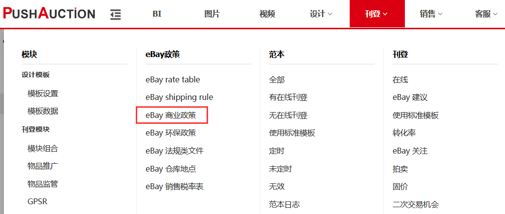 eBay商业政策(business policy)是指在刊登物品中,向买家提供的付款方式、运送及退货细节。