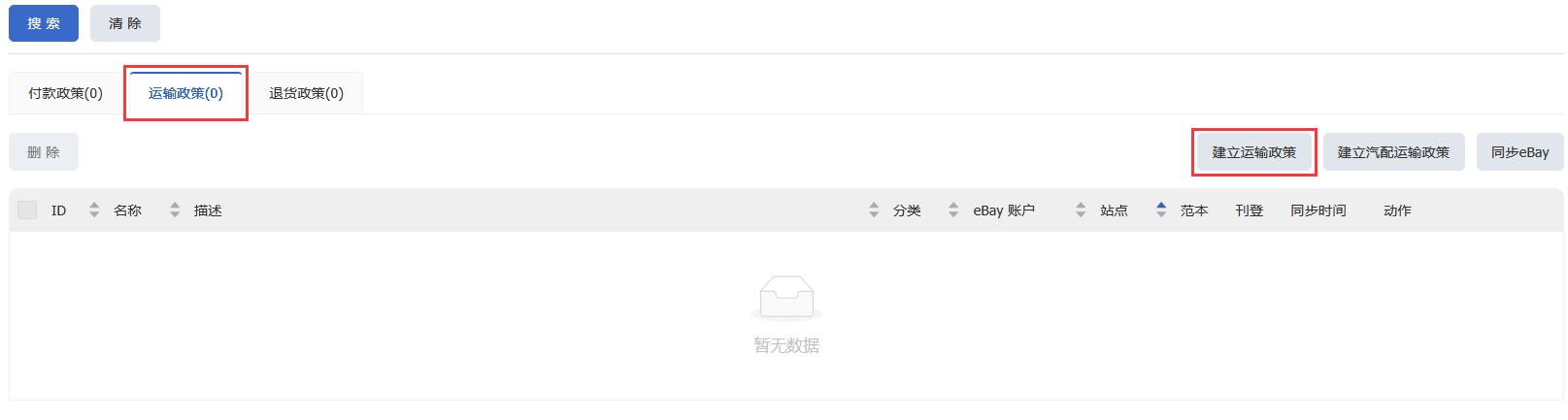 第二步:依次点击【付款政策】、【运输政策】、【退货政策】,分别点击【建立付款/运输/退货政策】;