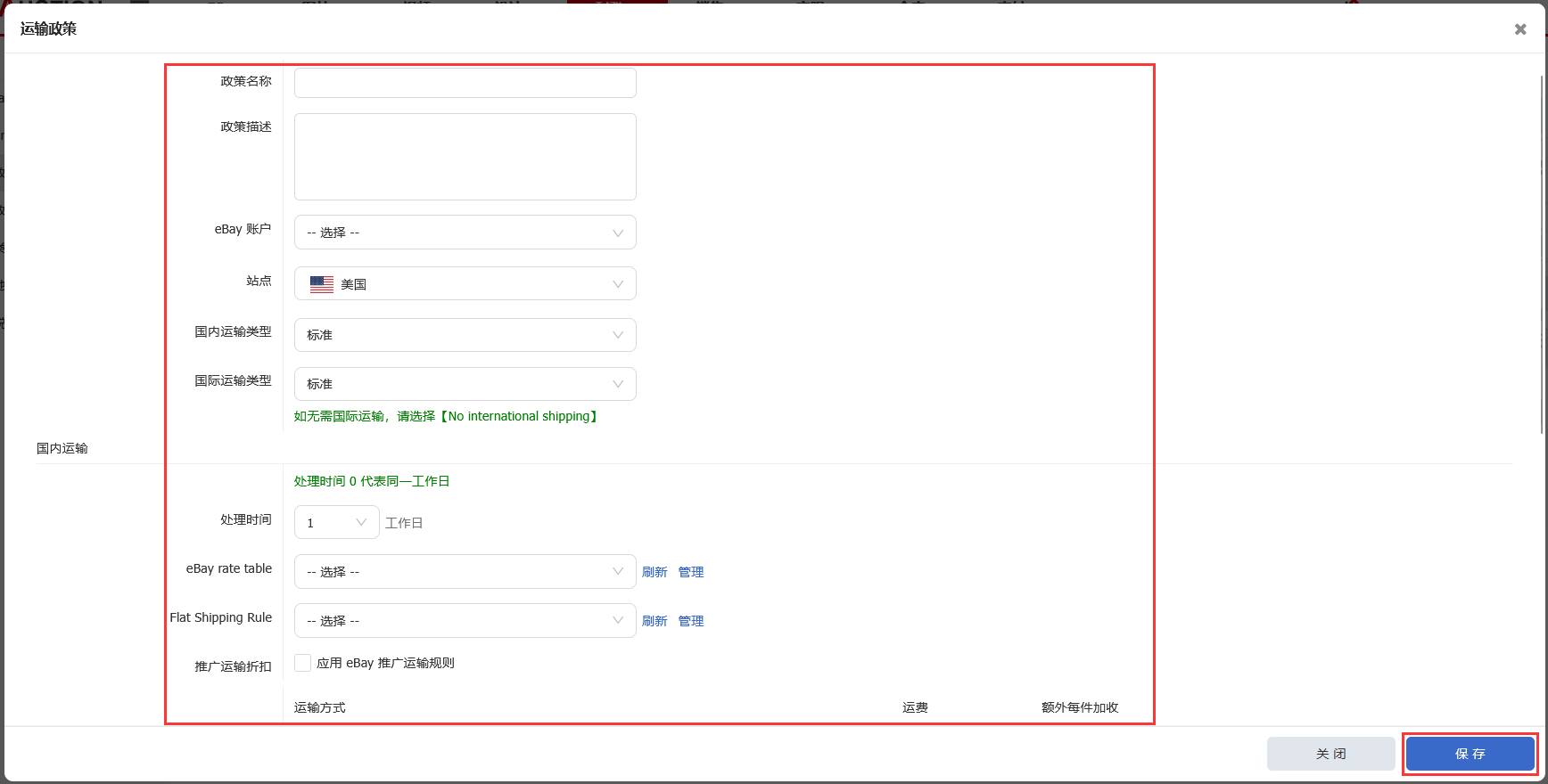 第三步:输入政策名称、按需输入政策描述 > 选择eBay账户、站点 > 设置具体政策内容 > 点击【保存】。