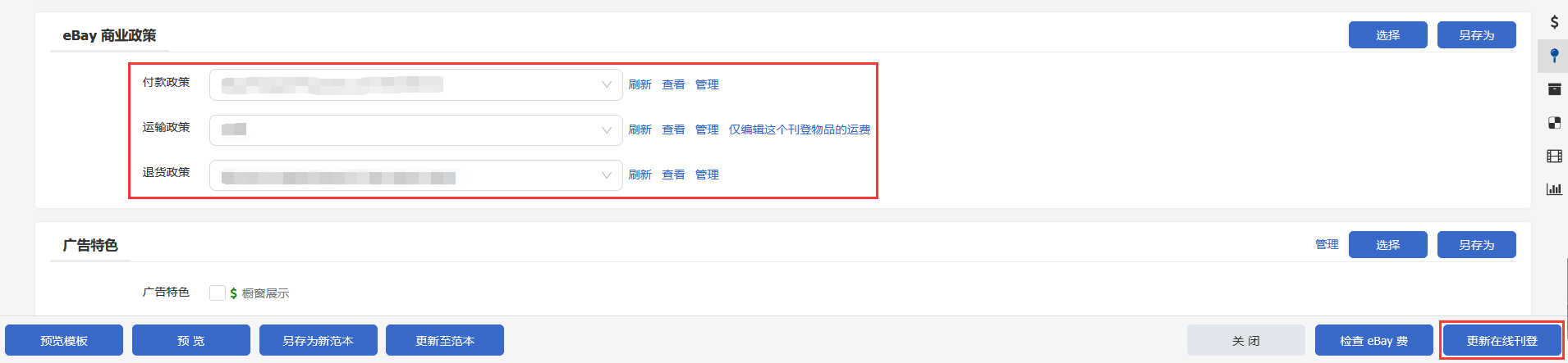 第三步:在【eBay商业政策】栏位,分别选择付款政策、运输政策和退货政策 > 点击【更新在线刊登】。