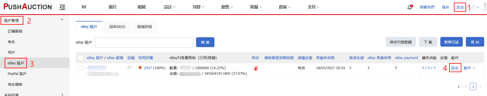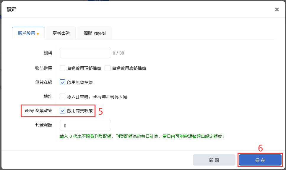 點擊右上角【設定】>【賬戶管理】>【eBay賬戶】> 右側【設定】> 勾選【啟用商業政策】 > 點擊【保存】。