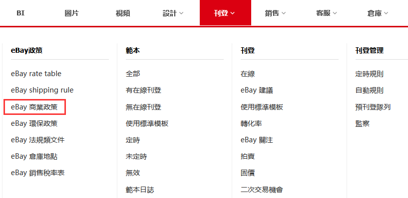 第一步:點擊【刊登】>【eBay 商業政策】;