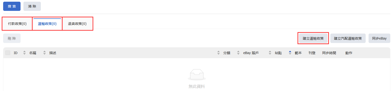 第二步:依次點擊【付款政策】、【運輸政策】、【退貨政策】,分別點擊【建立付款/運輸/退貨政策】;