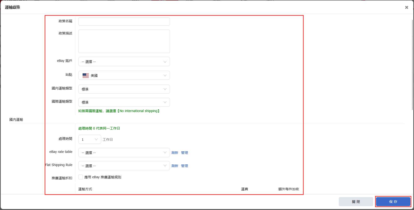 第三步:輸入政策名稱、按需輸入政策描述 > 選擇eBay賬戶、站點 > 設置具體政策內容 > 點擊【保存】。