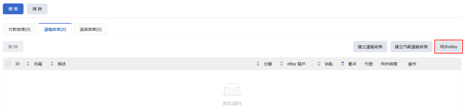 第二步:點擊【運輸政策】> 右上方【同步eBay】> 選擇eBay賬戶 > 點擊【同步eBay】。