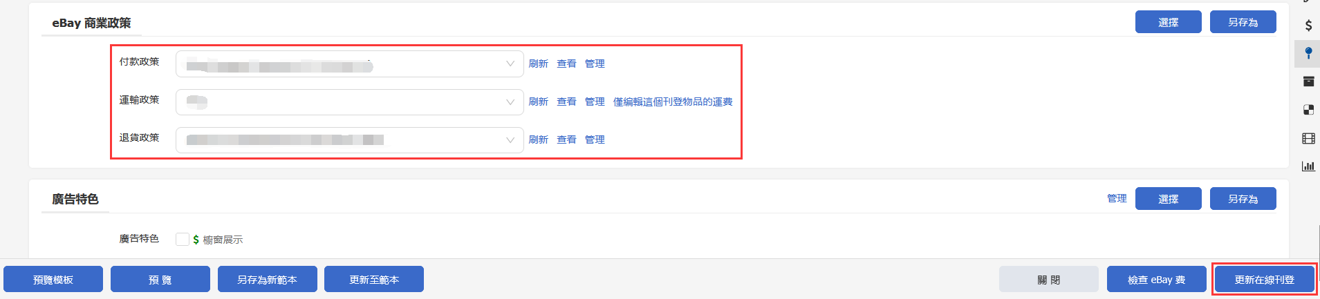 第三步:在【eBay商業政策】欄位,分別選擇付款政策、運輸政策和退貨政策 > 點擊【更新在線刊登】。