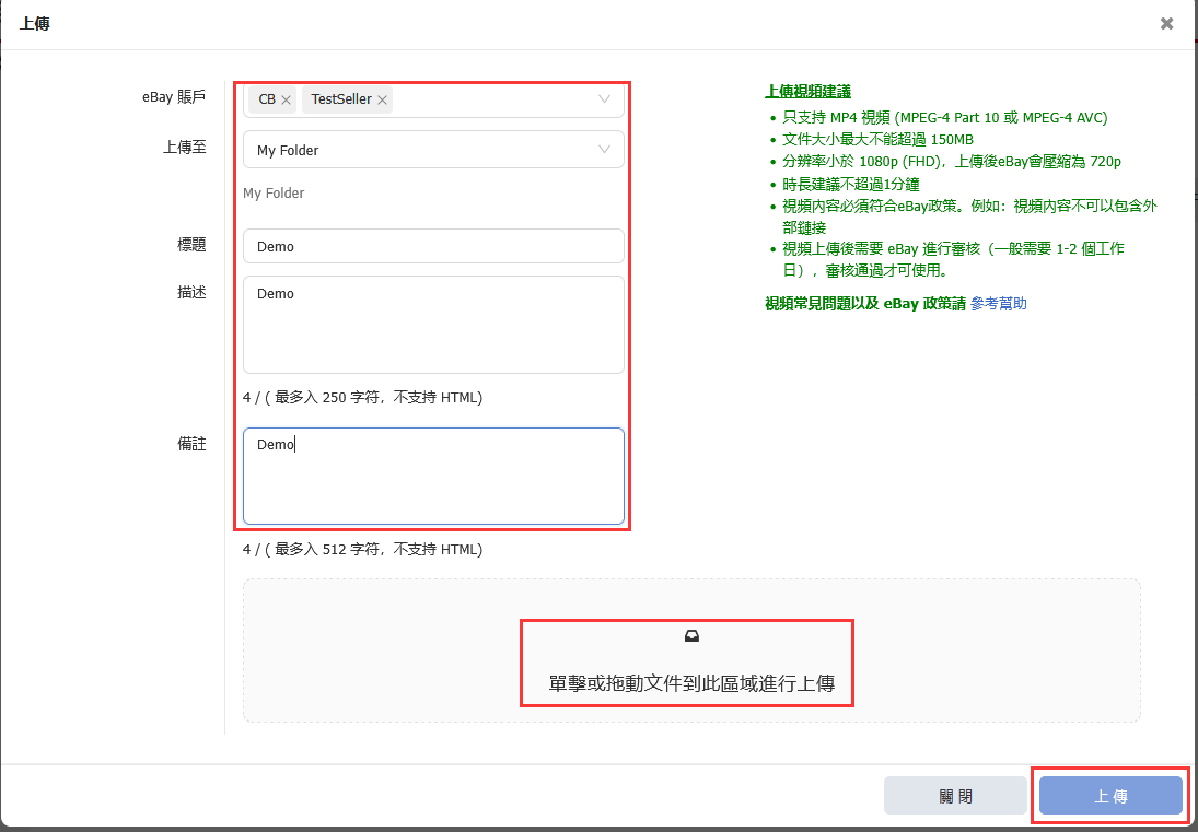 第二步:選擇eBay賬戶(可多選)、視頻資料夾 > 輸入標題、描述和備註 > 點擊【瀏覽】,選擇視頻文件 > 點擊【上傳】;