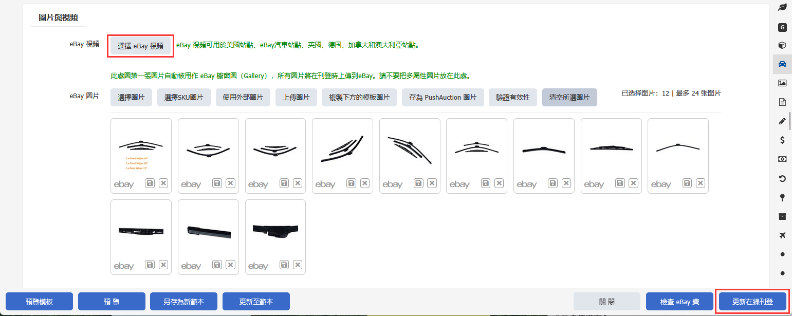 3.範本批量應用eBay視頻,請參考此幫助鏈接的【 範本更新 】功能。