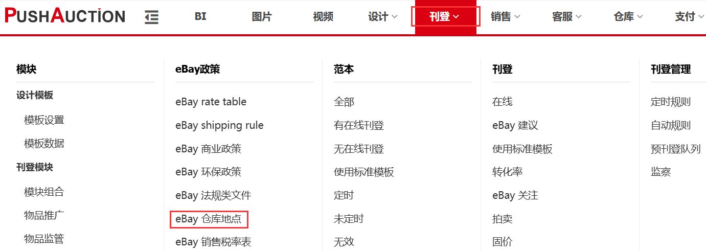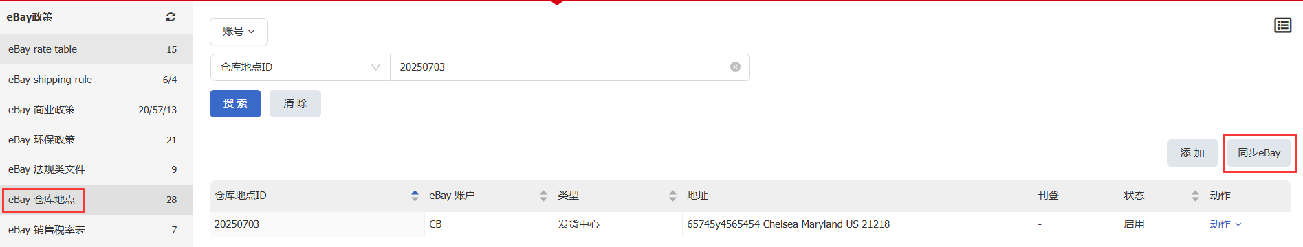 点击顶部菜单的 【刊登】-【eBay政策】-【eBay仓库地点】即可进入eBay仓库地点管理页面。
