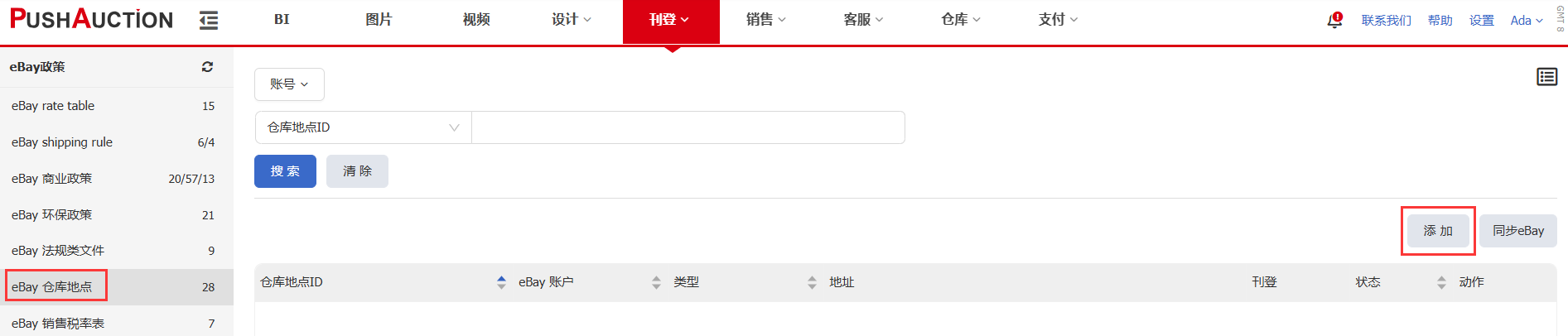 如果您已经在PushAuction以外的平台创建了eBay仓库地点,可以通过点击右上角的【同步eBay】按钮将数据同步到PushAuction。