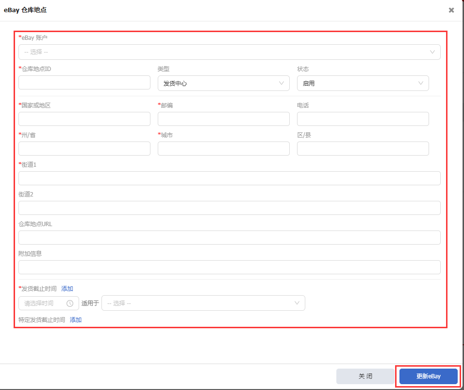 ② 选择eBay账户(可多选),填写仓库地点ID和详细地址,设定发货截止时间;