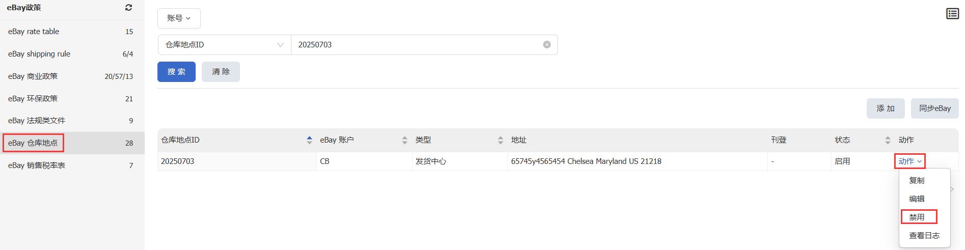 注意:当前阶段eBay不允许删除仓库地点,请使用“禁用”功能将仓库地点禁用。