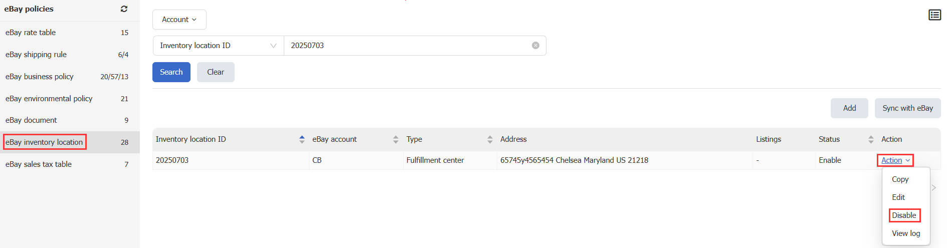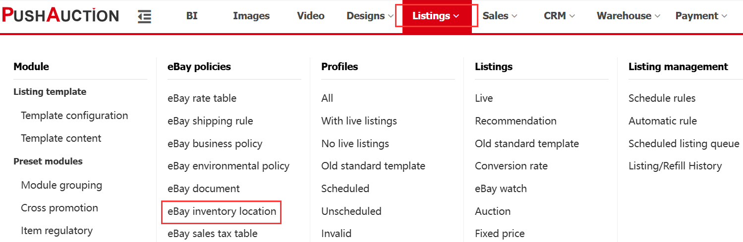 Navigate to the top menu: Listings → eBay policies → eBay inventory location.