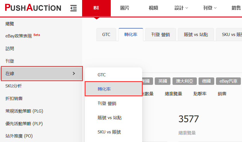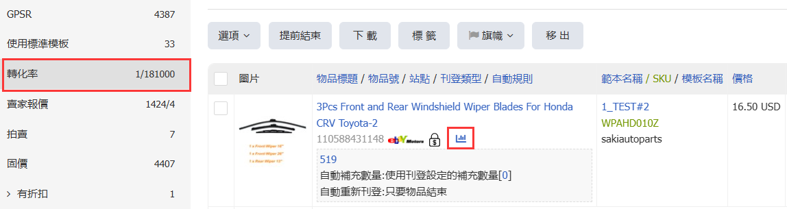 在刊登頁面,點擊左側菜單裏的【轉化率】> 物品號後面的分析圖標。