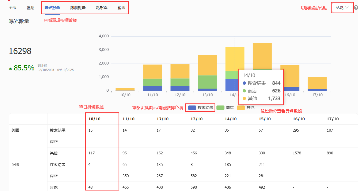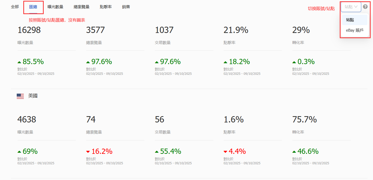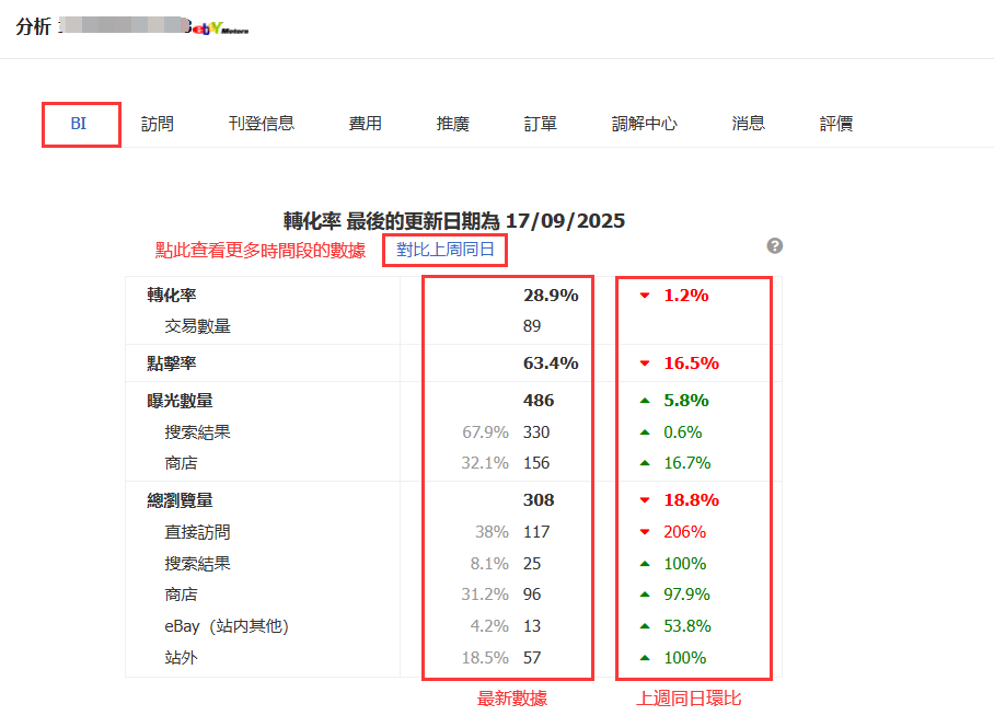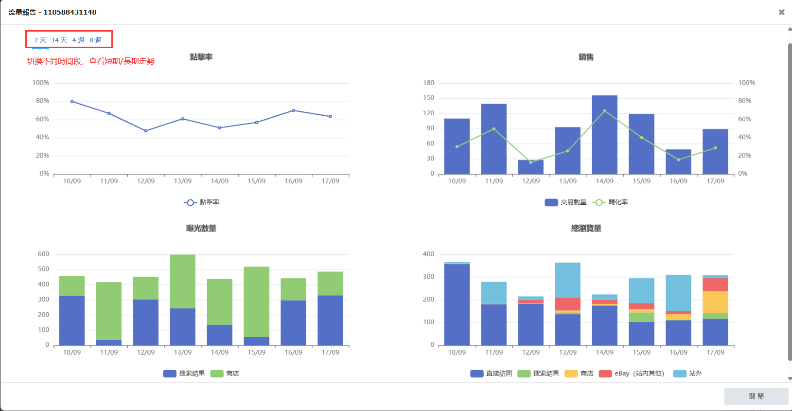 - 點擊率: 瀏覽數量與曝光數量的比例,衡量刊登對買家的吸引力。