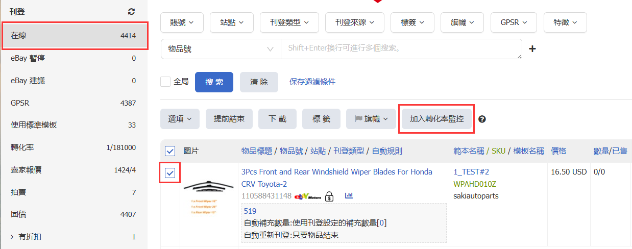 在刊登在線頁面,勾選刊登後,點擊【加入轉化率】。加入後至少要等壹天才能同步到數據。