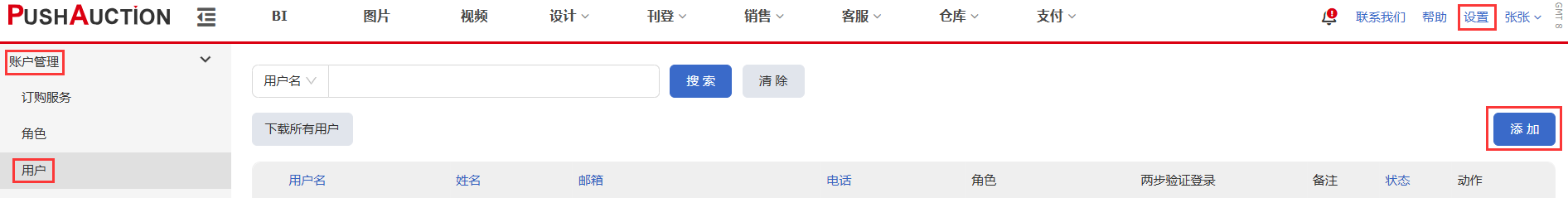 第一步:点击【设置】>【账户管理】>【用户】>【添加】;