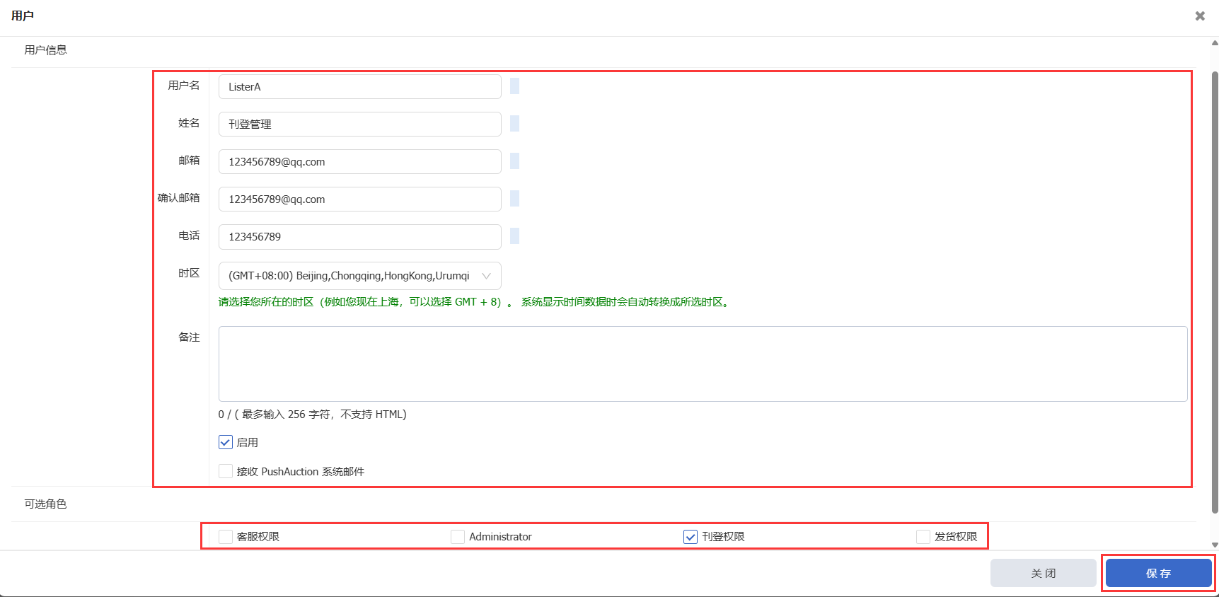 第二步:输入用户信息 > 勾选【启用】> 配置角色(可多选)>【保存】。