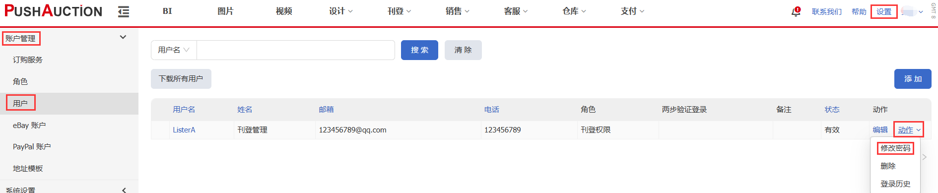 第一步:点击【设置】>【账户管理】>【用户】>【动作】 >【修改密码】;