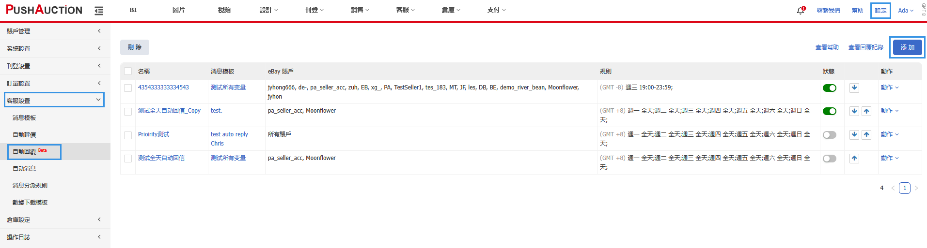 第一步:點擊右上角【設置】>【客服設置】>【自動回覆】>【添加】;