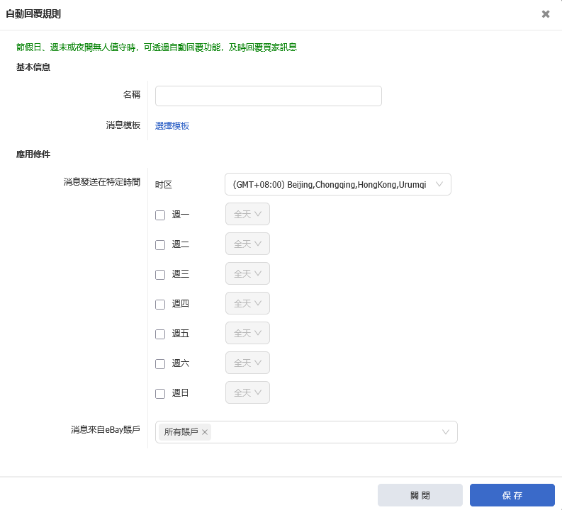 功能介紹:對於節假日、周末、夜間無人值守的情況,可以設置自動回覆買家消息,告知預計的人工回覆時間,提升買家滿意度等。