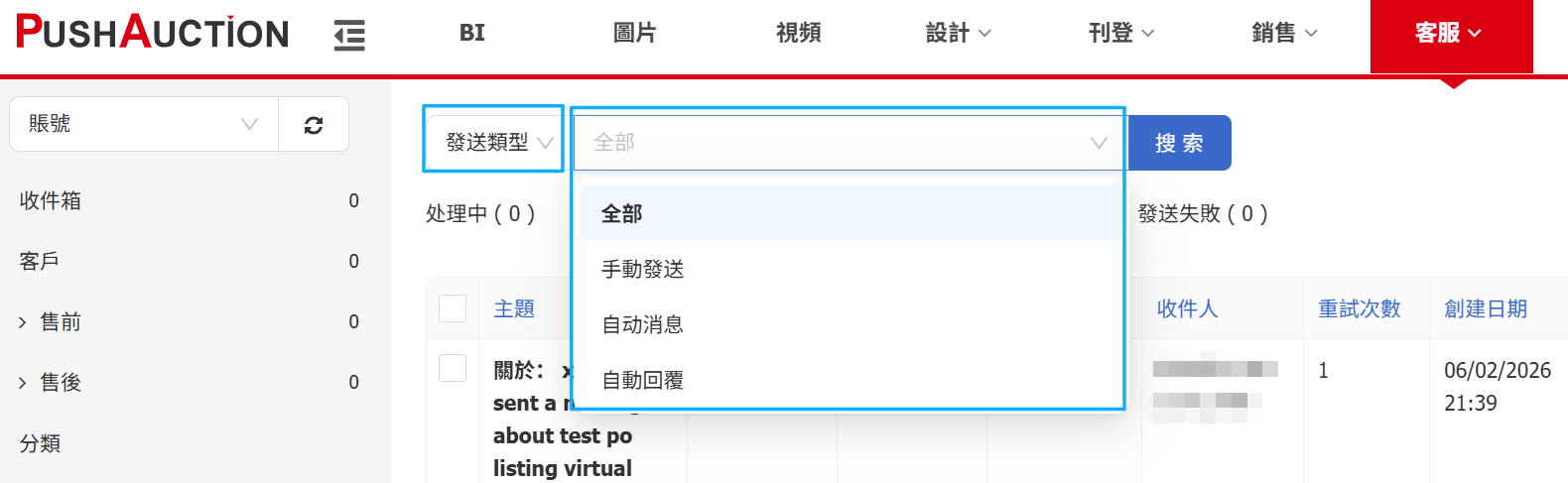 - 頁面頂部可通過“處理中/發送隊列/發送歷史/發送成功/發送失敗”標簽,快速篩選不同發送結果的記錄