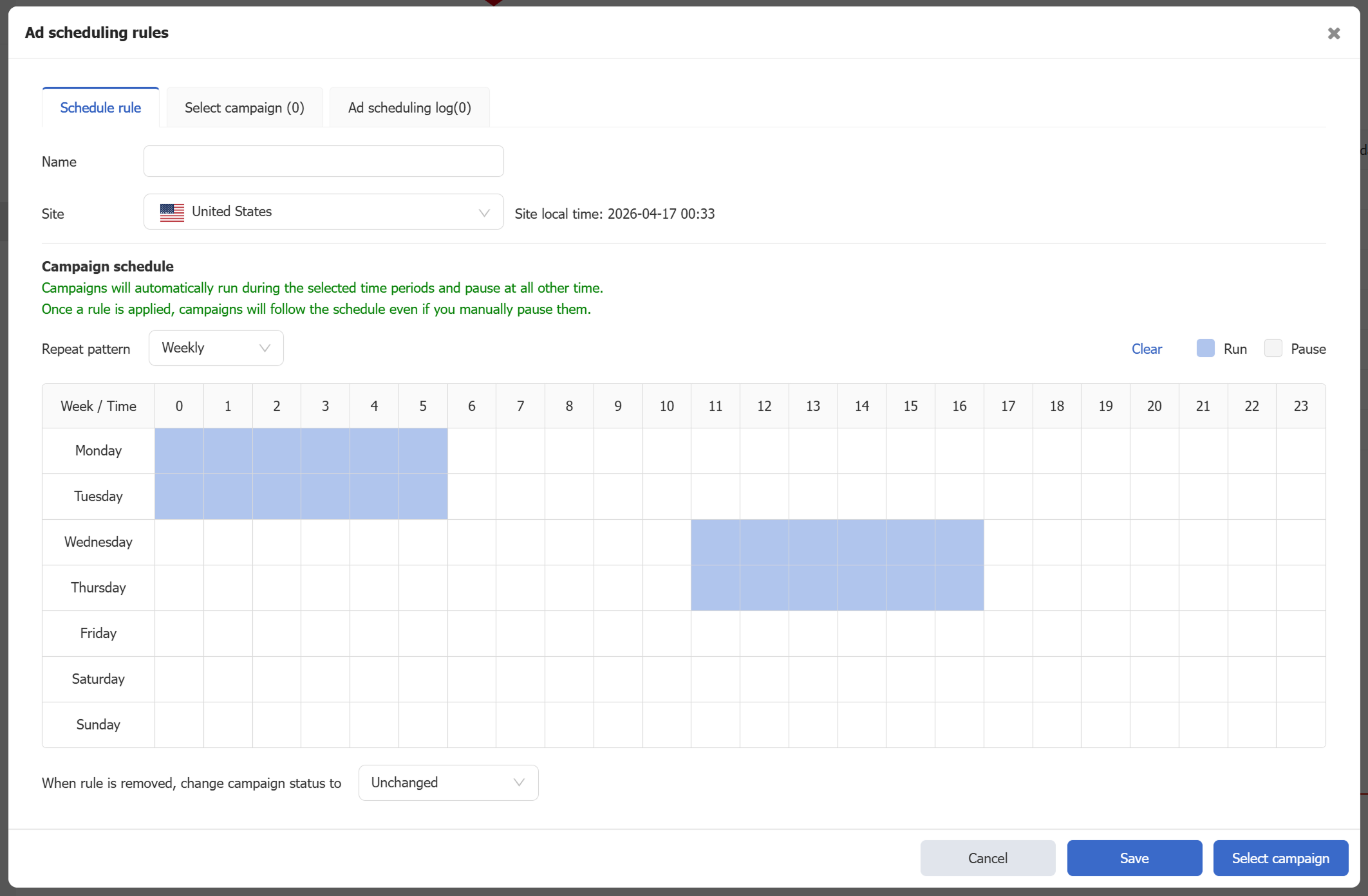 3) Set the campaign run time: drag across the grid to select the time blocks when campaigns should run. The blue cells indicate active time (click or drag again to clear a selection).