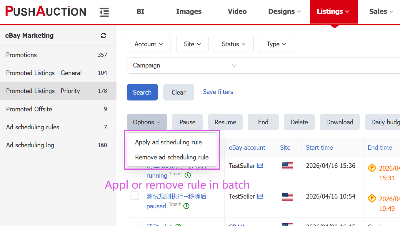 You can filter by account, site, and status to review when rules started and stopped campaigns.